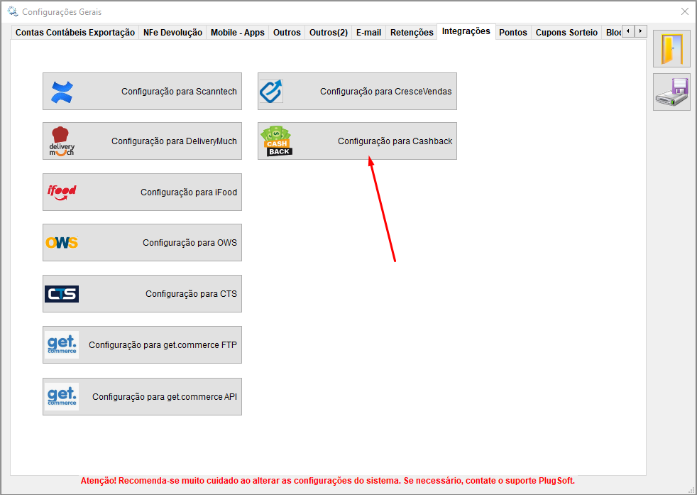 A guia Integrações, clicar em Configuração para Cashback: