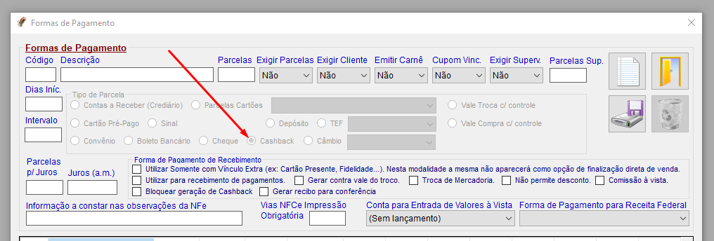 Após ativada a opção de Cashback, será necessário criar a Forma de Pagamento correspondente, acessando a configuração de Formas de Pagamento (contatar PlugSoft para isso) e marcar a opção correspondente abaixo: