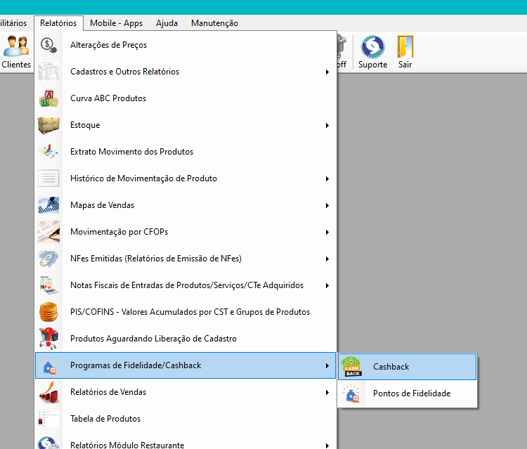 Acessar o menu Relatórios, Programas de Fidelidade/Cashback, Cashback: